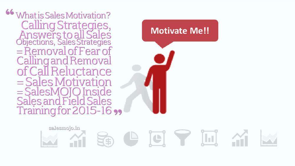 Sales Motivation= Calling Strategies + Answers to all Sales Objections + Sales Strategies = Removal of Fear of Calling and Removal of Call Reluctance = Sales Motivation.